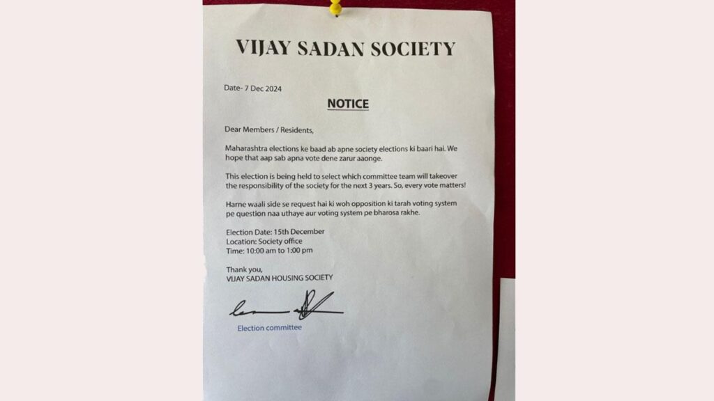 The notice humorously ties the upcoming society election to the recently concluded Maharashtra elections, stating, “Now that the Maharashtra elections are over, it’s time for our society’s election. We hope all members will exercise their valuable right to vote.”