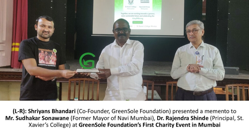 The event was graced by prominent guests such as Mr. Sudhakar Sonawane (Ex-Mayor of Navi Mumbai), alongside key stakeholders including Mr. Shriyans Bhandari (Founder, GreenSole Foundation), Ms. Vineta Fernandes (Head CSR, GreenSole Foundation), and Dr. Rajendra Shinde (Principal, St. Xavier’s College). Bhasin family from Ram Fashion Exports (corporate partner) also attended, underscoring the growing alliance between industry and non-profits in promoting sustainability.